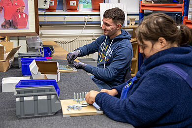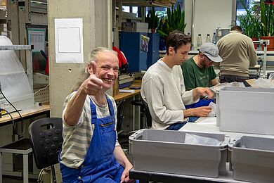 Zu Ihnen gehört auch Michaela Schneider. In ihrer Funktion als Reha-Beraterin der Agentur für Arbeit Leipzig steht sie in engem Austausch mit der Diakonie am Thonberg und hat bereits zahlreiche Klient*innen erfolgreich auf diesem Weg begleitet. Beim Schichtwechsel konnte sie selbst mit anpacken, Tätigkeiten in Montage und Verpackung ausprobieren und so einen direkten Einblick in den Arbeitsalltag gewinnen. Besonders beeindruckt hat Michaela Schneider die offene und wertschätzende Atmosphäre im Team: „Schon beim ersten Kennenlernen war die Atmosphäre sehr herzlich. Das Team war neugierig, wer da neu dazukommt und ich wurde offen und freundlich aufgenommen.“